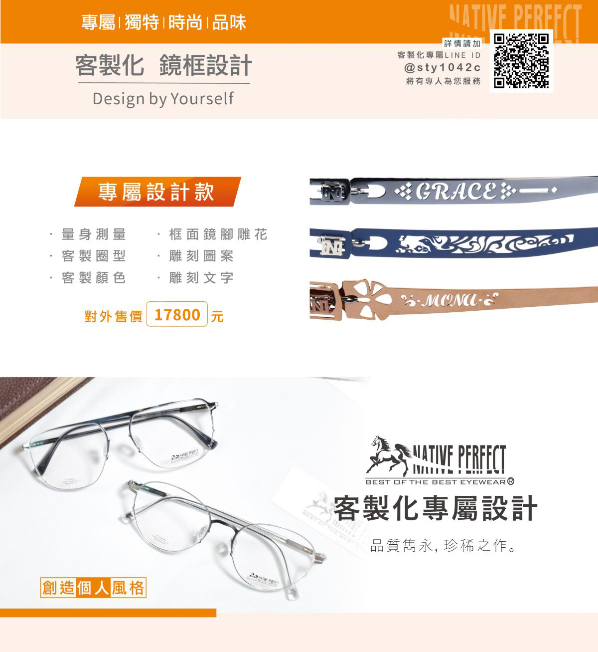 NATIVE PERFECT客製化鏡框,個人化設計新選擇, 將讓您展現專屬自己的風格與態度,不懈追求完美,近乎苛求,品質雋永, 珍稀之作。